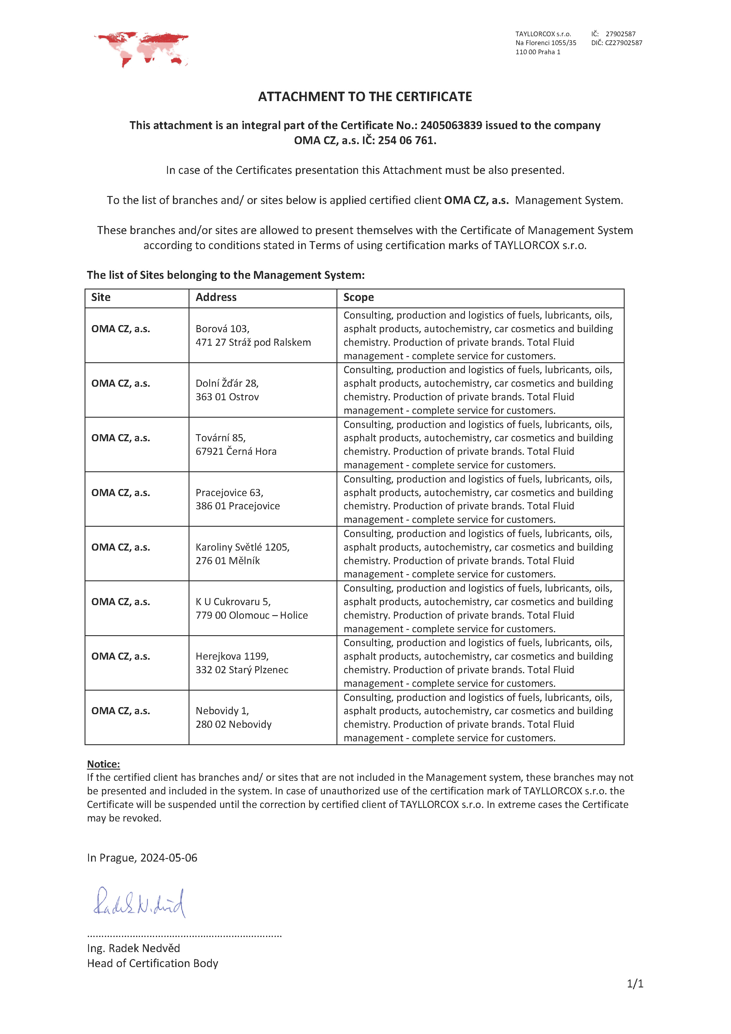 Díky celorepublikovému pokrytí distribučními sklady: Stráž pod Ralskem, Mělník, Kolín, Ostrov nad Ohří, Pracejovice, Starý Plzenec, Olomouc a Černá Hora; mnoha kvalifikovanými obchodně-technickými zástupci (certifikovaní tribotechnici - tribodiagnostici) a vlastní logistikou je společnost OMA CZ, a.s. schopna poskytovat kompletní, odborný, flexibilní a rychlý servis všem svým zákazníkům.